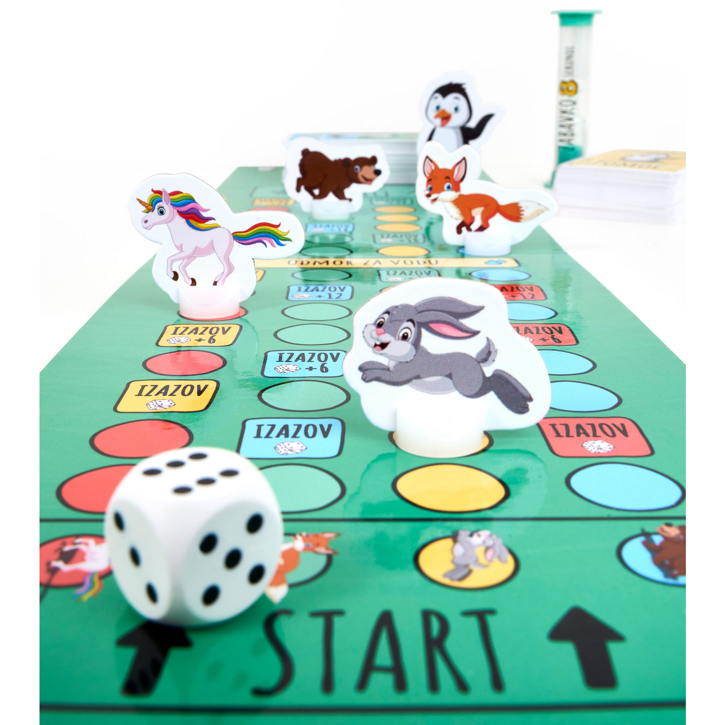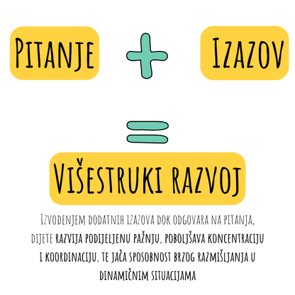 Brza, dinamična i prepuna smijeha, ova igra stavlja na test tvoju brzinu razmišljanja i fizičku spretnost – dok odgovaraš, možda ćeš morati glumiti mačku četveronoške, sjediti na zamišljenoj stolici ili balansirati na jednoj nozi! Ali ne brini – tu su i KARTICE POMOĆI da te izvuku iz nezgodne situacije. A možda te i KOCKICA SREĆE (ILI NESREĆE) iznenadi nečim potpuno neočekivanim!