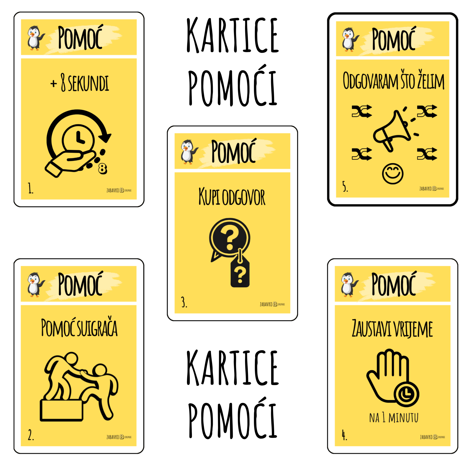 6. KARTICE POMOĆI – +8 sekundi, pomoć suigrača, kupi odgovor, zaustavi vrijeme, odgovaram što želim... ali koristi ih pametno!